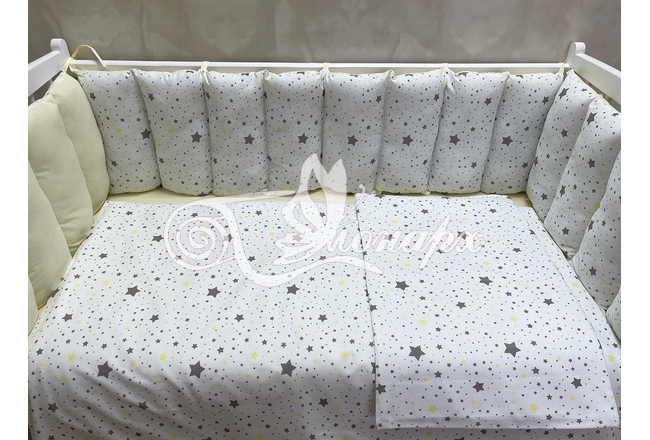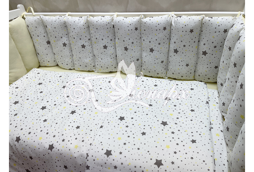 - Бортик-заборчик стеганый с синтепоном, плотно забит синтепухом (на замочках): - 2 шт. 60х34 см / - 2 шт. 120х34 см.