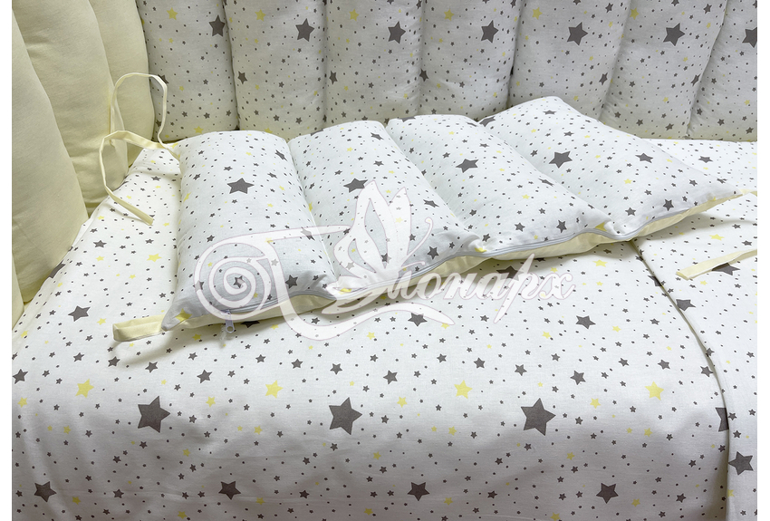 Бортики на замочках в кроватку: защитят Вашего малыша от ушибов, сквозняков, солнечных лучей и не дадут малышу запутаться в прутьях кроватки. - Подушка (100% хлопок- бязь) - 40х60 см.