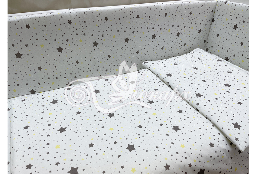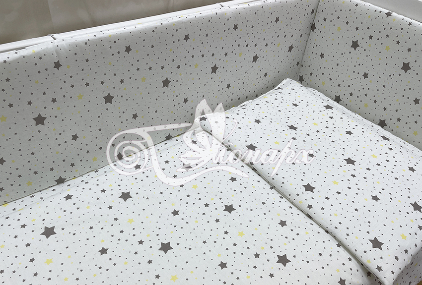 Бортики СО СЪЕМНЫМИ ЧЕХЛАМИ в кроватку: защитят Вашего малыша от ушибов, сквозняков, солнечных лучей и не дадут малышу запутаться в прутьях кроватки. - Простыня на резинке 60х120 см (подходит для стандартной кроватки)