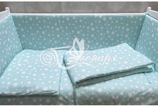 Бортики СО СЪЕМНЫМИ ЧЕХЛАМИ в кроватку: защитят Вашего малыша от ушибов, сквозняков, солнечных лучей и не дадут малышу запутаться в прутьях кроватки. - Простыня на резинке 60х120 см (подходит для стандартной кроватки)