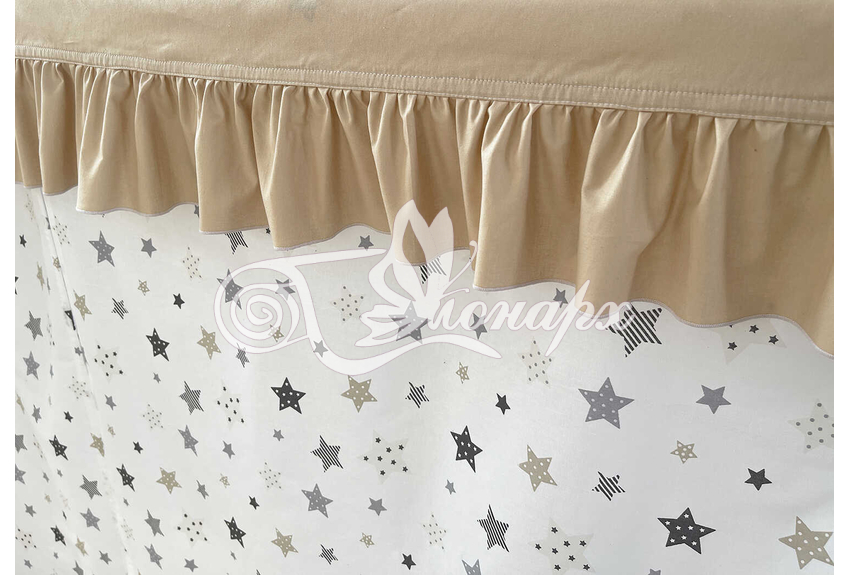 ширина - 137 см + 24 см на рюши (по 12 см на одну сторону). - Занавески с завязками (по 4 завязки на каждой занавеске) на переднюю сторону кроватки 2 шт.: