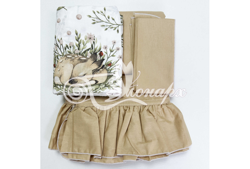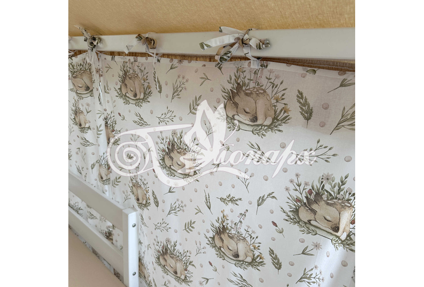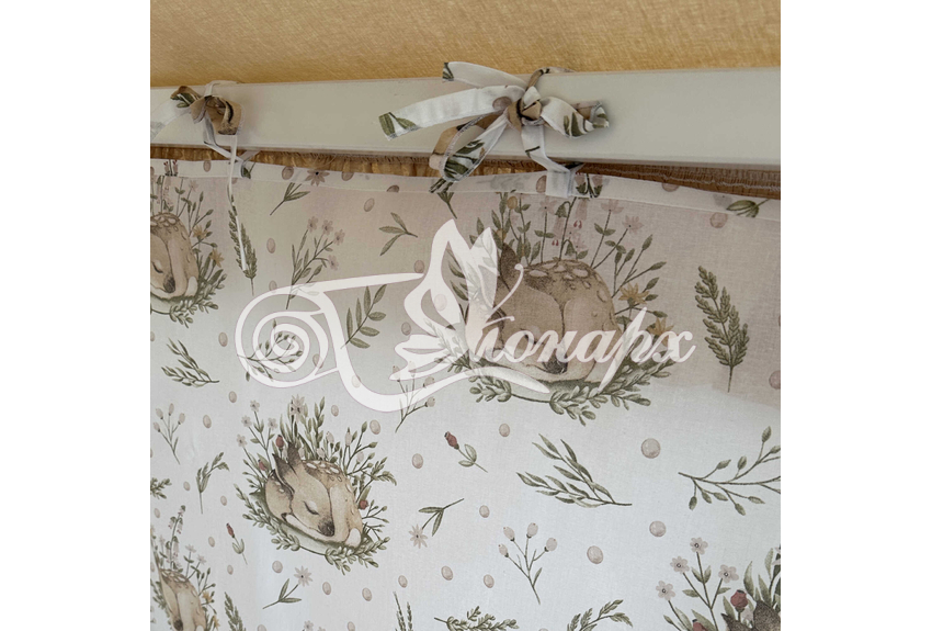 ширина - 137 см + 24 см на рюши (по 12 см на одну сторону). - Занавески с завязками (по 4 завязки на каждой занавеске) на переднюю сторону кроватки 2 шт.: