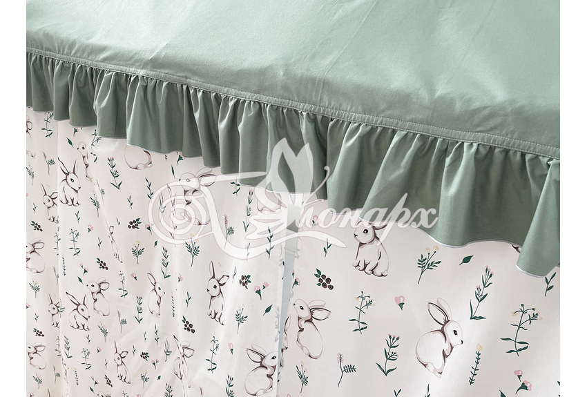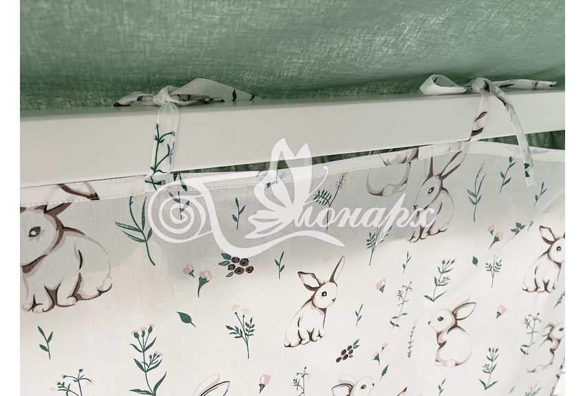 ширина - 137 см + 24 см на рюши (по 12 см на одну сторону). - Занавески с завязками (по 4 завязки на каждой занавеске) на переднюю сторону кроватки 2 шт.: